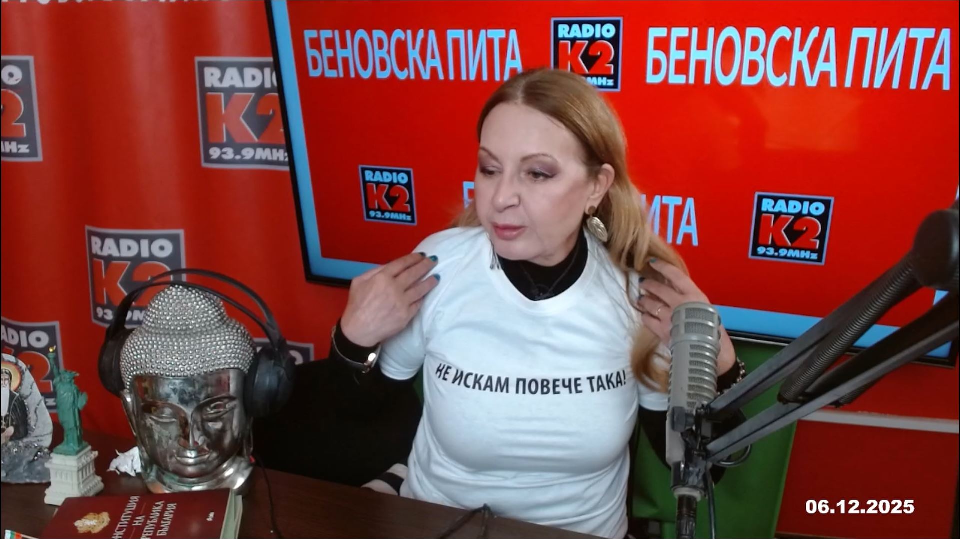 Илиана Беновска: Та така, уважаеми зрители, слушатели, приятели, неприятели, но уважаеми българи с цялото уважение към вас и моля и вие да имате уважение към мен и събеседниците! И моля ви да бъдете малко по-самокритични към себе си. И моля ви да разберете, че журналистиката също, не журналистиката, а аз имам право да си избера събеседниците! Както имам право и да реша кои са новините за нашите медии, за ютюб канала Беновска пита-Радио К2 и Радио К2 и заедно с Канал 3 да споделим тези новини, които Канал 3 също има право да си избере! Кои са новините и лицата! Защото дали е новина, че Делян Пеевски си измисли, че има някакво етническо напрежение? Кажете де! Ами не е, няма такова! Дали е новина, че някой му сядал в скута, въпросния Иво Мирчев, и Божидар Божанов, че му бъркам фамилията, и тази хубавицата Надежда Йорданова! И ред техни съпартийци, които не щат да идват! Защо ли пък да идват?! Защо ли пък да идват, аз ще спра да ги каня! Та новина ли е, че някой сяда в скута на Пеевски? Ами не е новина, това не е новина за България! Нали новините трябва да бъдат за хората, а не ние да се занимаваме с техните селски истории! Кой какво рекъл, кому рекъл, щял да рече и какво-що! Между нас и Атанас Зафиров, здравей Наско, нещо много голем стана начело на БСП! Но както ти казах - sic transit gloria mundi! Та не щеш и ти да дойдеш, но защо ли да дойдеш, като ще трябва да мрънкаш като президента Радев в своето обръщение към народа преди няколко дни?! Защо говориш ти, Радев, в множествено число? Аз не знам нещо да сме правили заедно с теб или ти нещо да си направил за мен, за нас! И въобще какво си въобразявате?