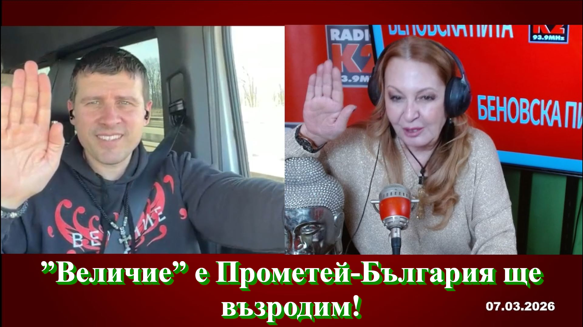 Ивелин Михайлов, „Величие", пред Илиана Беновска в youtube ТВ Беновска пита-Радио К2, фейсбук страницата на предаването "Беновска пита", профила Iliana Benovska, Радио К2 и Канал 3 на 7-и март 2026 година.